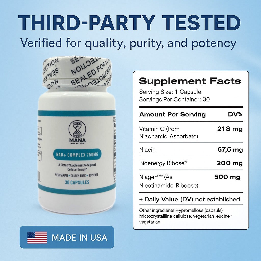 Mana Nutrition NAD+ Complex 750MG supplement – with Niacin & Vitamin C – Vegan, Gluten-Free, Non-GMO – 30 Capsules