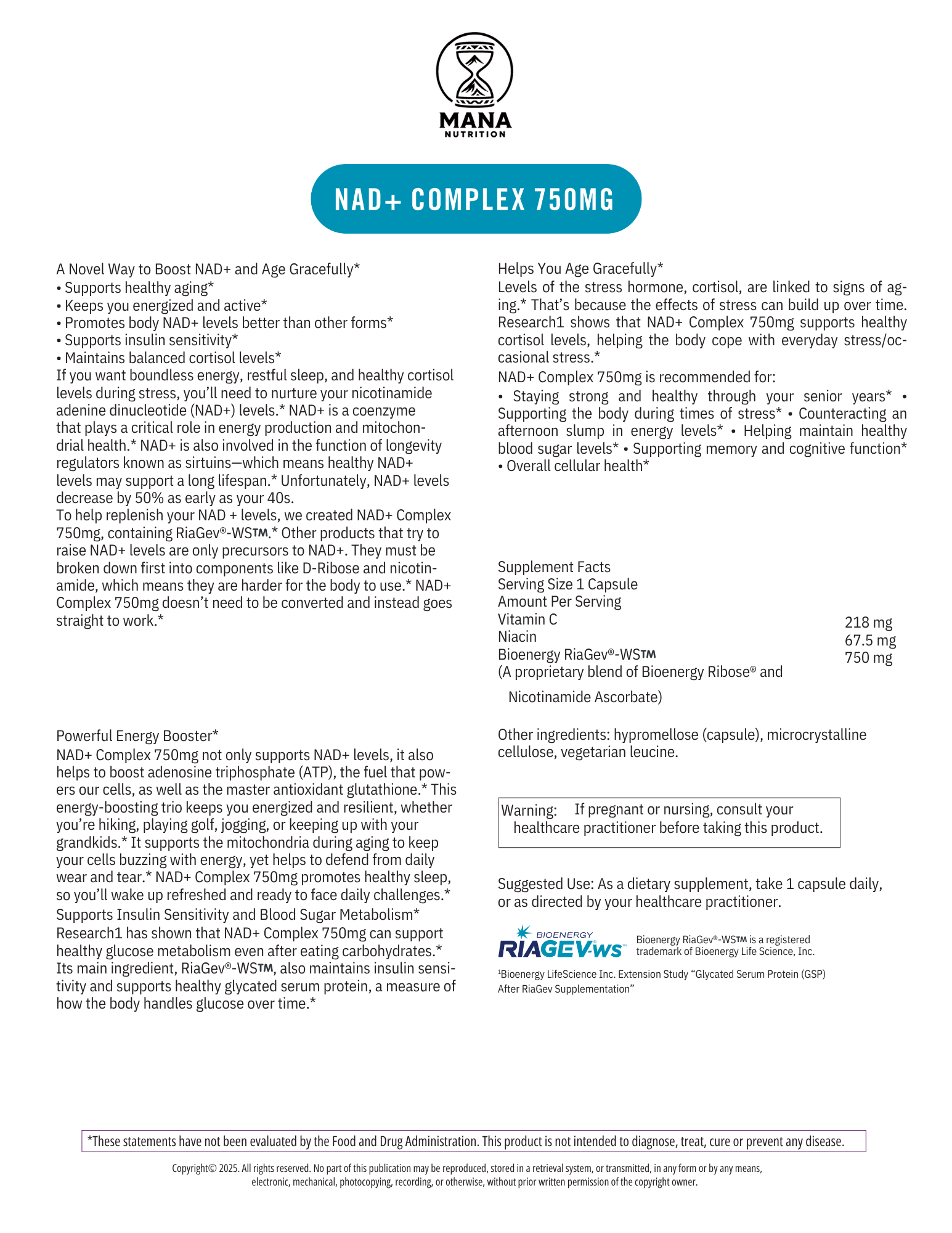 Mana Nutrition NAD+ Complex 750MG supplement – with Niacin & Vitamin C – Vegan, Gluten-Free, Non-GMO – 30 Capsules